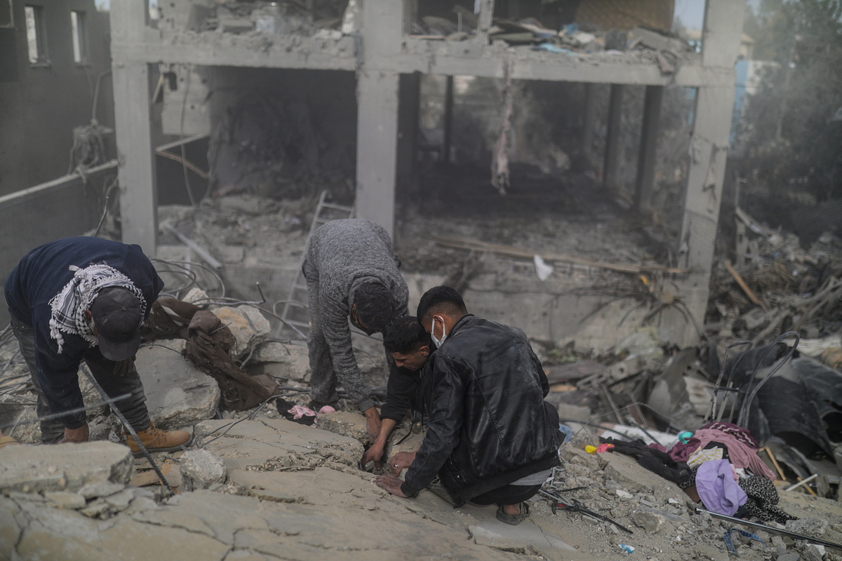epa11174278 Palestinians search for bodies and survivors among the rubble of a destroyed house following an Israeli air strike on Deir Al Balah, southern Gaza Strip, 23 February 2024. According to the Palestinian Ministry of Health, more than 18 members of the same family were killed and 22 remain trapped under the rubble following an overnight Israeli air strike. More than 29,400 Palestinians and over 1,300 Israelis have been killed, according to the Palestinian Health Ministry and the Israel Defense Forces (IDF), since Hamas militants launched an attack against Israel from the Gaza Strip on 07 October 2023, and the Israeli operations in Gaza and the West Bank which followed it. EPA/MOHAMMED SABER