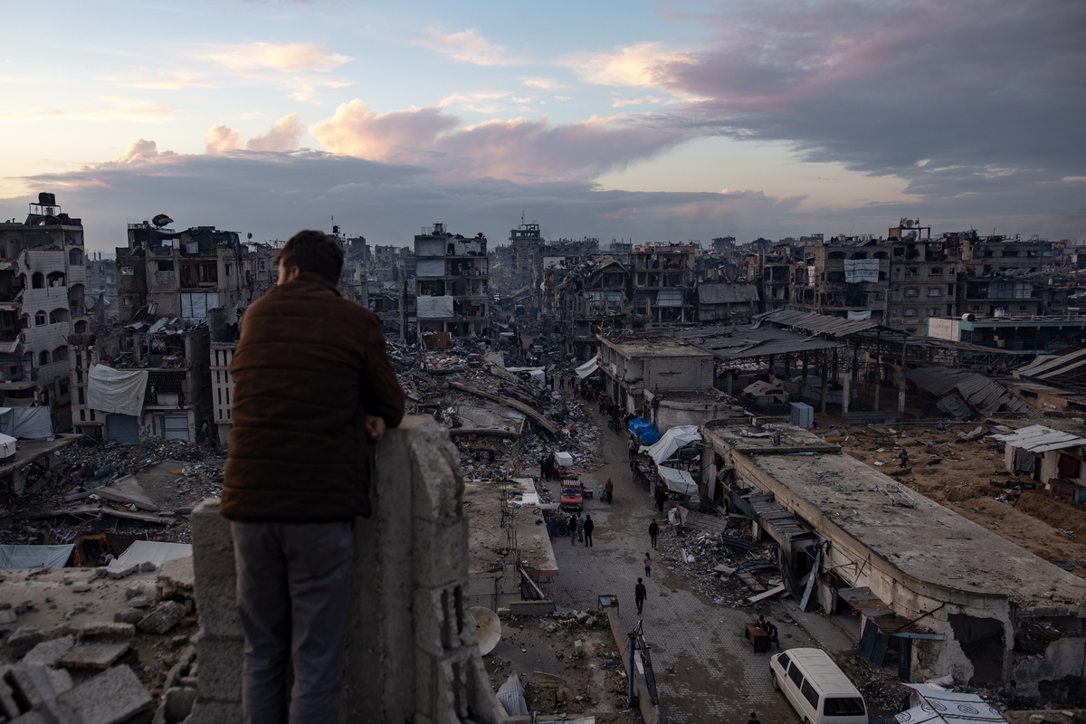 epa11888828 A Palestinian man looks at destroyed buildings in the Jabalia camp, north of Gaza City, 11 February 2025. Israel and Hamas implemented the first phase of a hostage release and ceasefire deal on 19 January 2025. More than 48,000 Palestinians have been killed in the Gaza Strip, according to the Palestinian Ministry of Health, since Israel launched a military campaign in the strip in response to a cross-border attack led by the Palestinian militant group Hamas on 07 October 2023, in which about 1,200 Israelis were killed and more than 250 taken hostage. EPA/HAITHAM IMAD