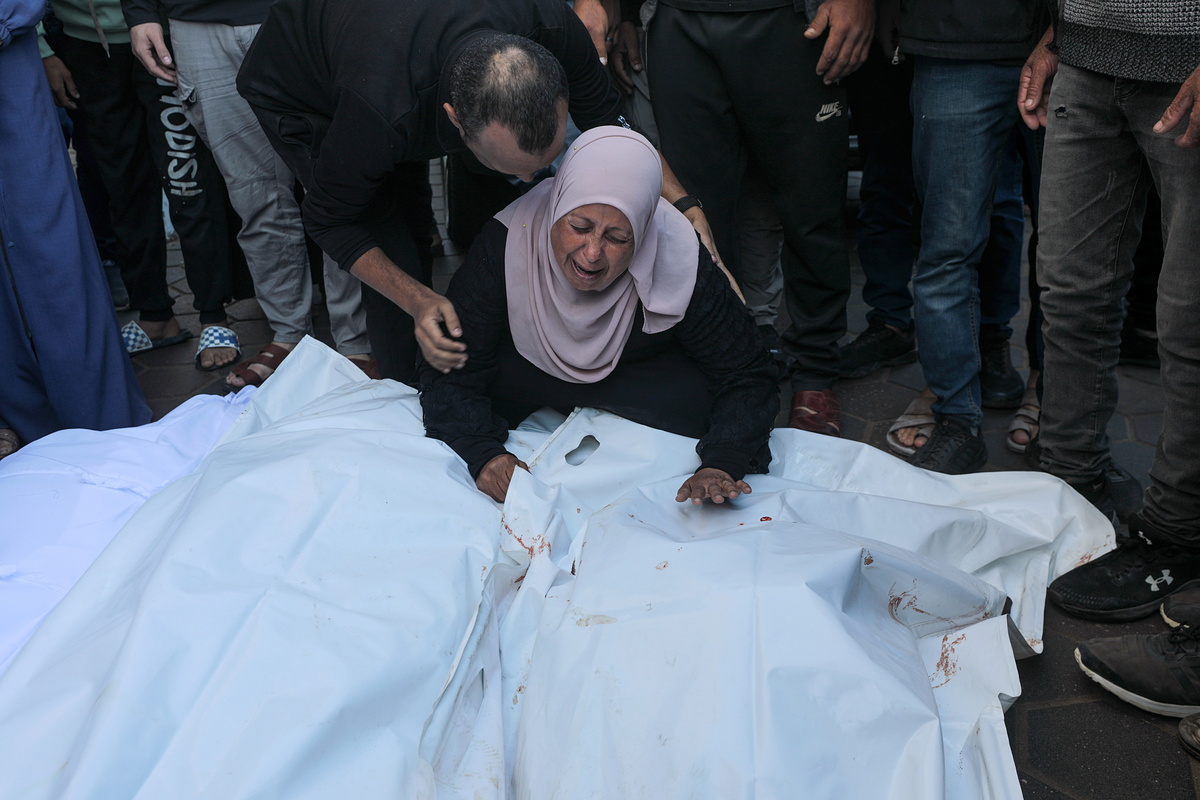epa11725878 A woman mourns over the covered bodies of members of the Abu Irmana family, killed on 16 November in an Israeli airstrike in the west of the Al-Nusairat refugee camp, during their funeral at the Al-Aqsa Martyrs hospital in Deir Al Balah, central Gaza Strip, 17 November 2024. More than 43,800 Palestinians, including over 13,000 children, have been killed according to the Palestinian Ministry of Health and over 1,400 Israelis have been killed according to the Israel Defense Forces (IDF), since Hamas militants launched an attack against Israel from the Gaza Strip on 07 October 2023, and the Israeli operations in Gaza and the West Bank which followed it. EPA/MOHAMMED SABER