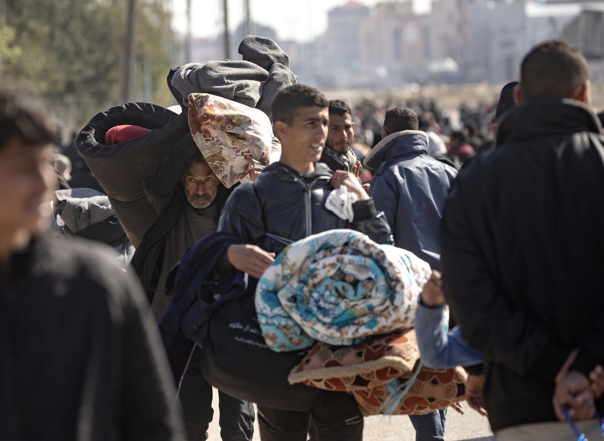 epa11106233 Displaced Palestinians walk past Israeli army tanks asfter the Israeli army asked residents of Khan Yunis camp to leave their homes and go to Rafah camps near the Egyptian border, south of the Gaza Strip, 26 January 2024. At least 26,000 Palestinians and at least 1,330 Israelis have been killed, according to the Palestinian Health Ministry and the Israel Defense Forces (IDF), since Hamas militants launched an attack against Israel from the Gaza Strip on 07 October 2023, and the Israeli operations in Gaza and the West Bank which followed it. Since 07 October 2023, up to 1.9 million people, or more than 85 percent of the population, have been displaced throughout the Gaza Strip, some more than once, according to the United Nations Relief and Works Agency for Palestine Refugees in the Near East (UNRWA), which added that most civilians in Gaza are in 'desperate need of humanitarian assistance and protection'. EPA/HAITHAM IMAD