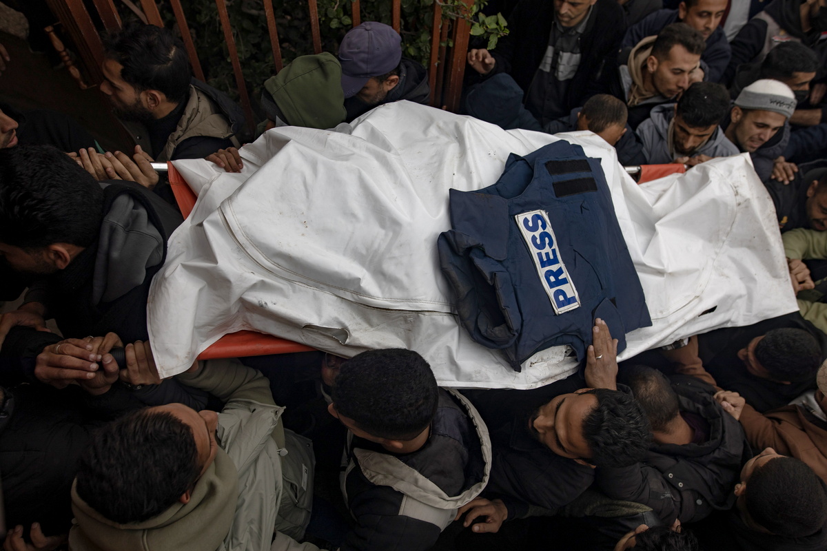 epa12667915 Mourners carry the bodies of three journalists through Nasser Hospital in Khan Yunis, southern Gaza Strip, 21 January 2026. The journalists were killed when an Israeli airstrike targeted their vehicle in the central Gaza Strip earlier in the day. According to the Palestinian Ministry of Health in Gaza, at least 11 people have been killed and six others injured in a series of Israeli attacks across the territory since this morning. EPA/HAITHAM IMAD