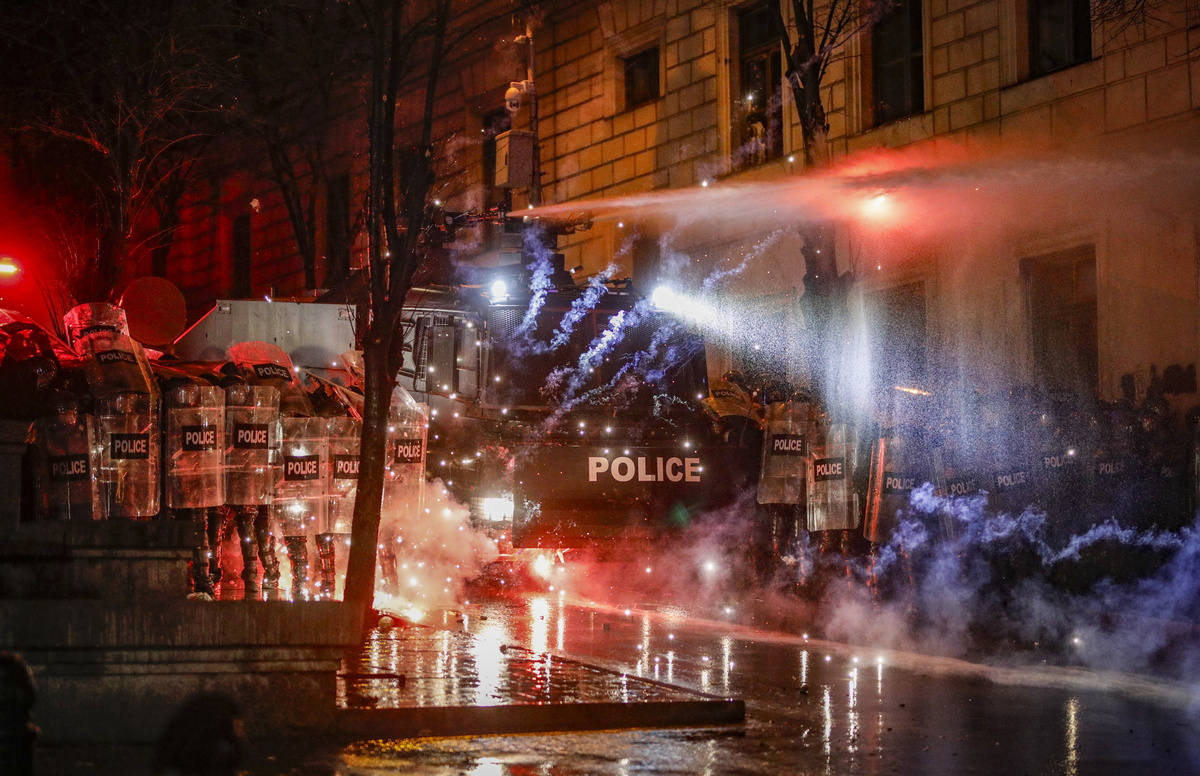 epaselect epa11753572 Police use water cannons to disperse Georgian opposition supporters protesting in front of the Parliament building in Tbilisi, Georgia, 02 December 2024. Thousands of pro-EU activists demonstrated in the Georgian capital to protest against the country's ruling party decision to suspend accession talks with the European Union (EU) until the end of 2028. EPA/DAVID MDZINARISHVILI