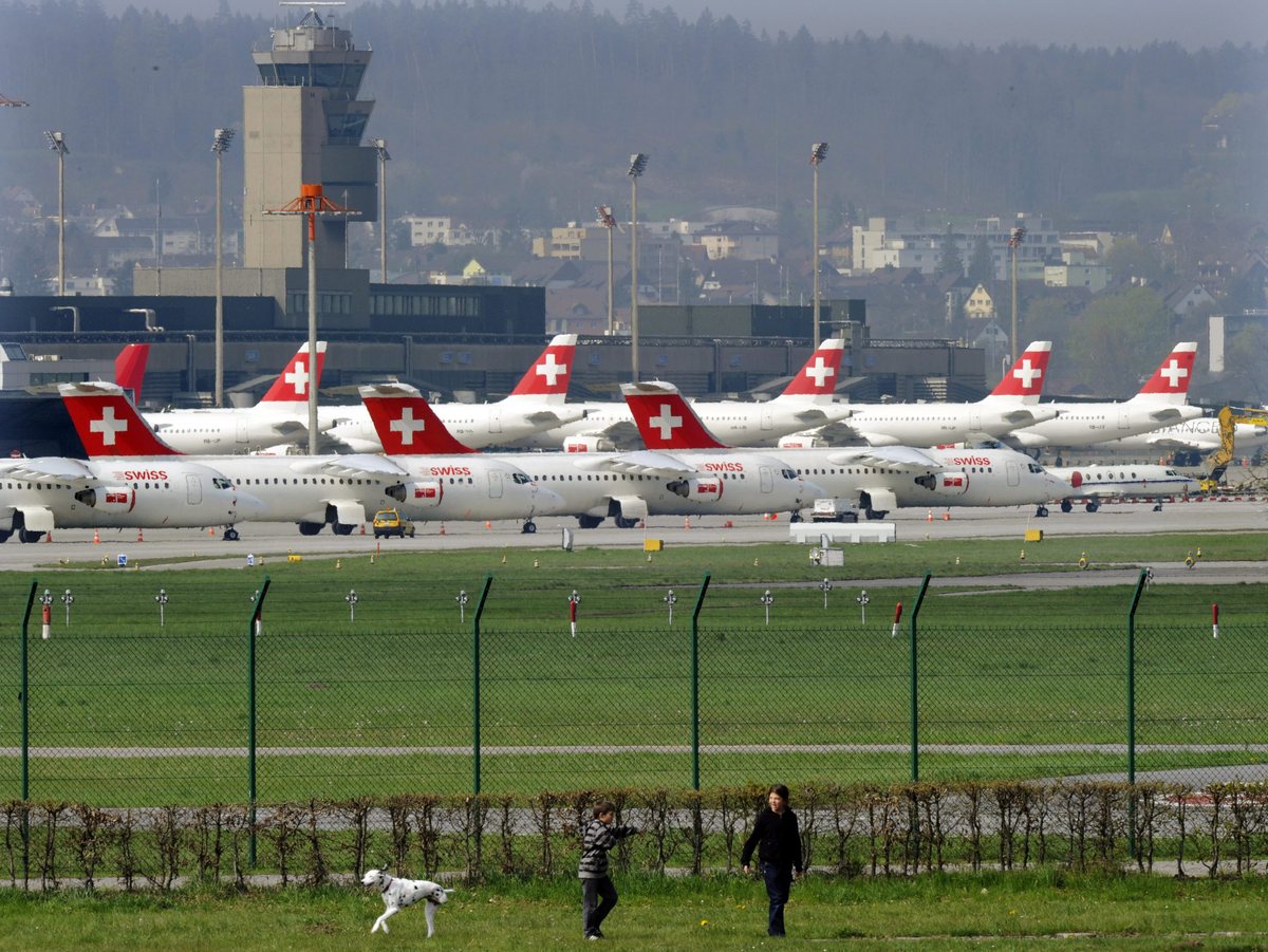 epa02120849 Swiss Airlines planes stand on the tarmac at Zurich airport, Switzerland, 17 April 2010. Due to the volcanic ash cloud from the eruption under the Eyjafjallajokull glacier in Iceland, all flights from and to all Swiss airports were suspended. EPA/STEFFEN SCHMIDT