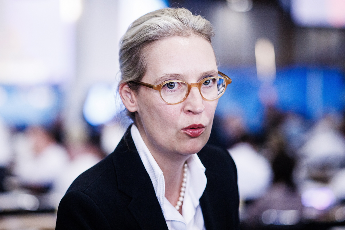 epa10773898 Alternative for Germany co-chairwoman Alice Weidel speaks in an conversation during the AfD party convention in Magdeburg, Germany, 28 July 2023. The Alternative for Germany (AfD) holds their 14th federal party congress in Magdeburg on 28 July 2023, followed by a five day European Elections assembly. EPA/CLEMENS BILAN
