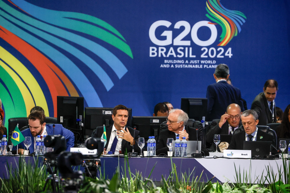 epa11187060 Central Bank of Brazil President Roberto Campos Neto (C-L) participates in a G20 Economy Ministers' meeting in Sao Paulo, Brazil, 28 February 2024. The Group of 20 (G20) economy and finance ministers, as well as central bank governors meet in Sao Paulo on 28 and 29 February in the run-up to the G20 Summit to be held in Rio de Janeiro on 18 and 19 November 2024. EPA/SEBASTIAO MOREIRA