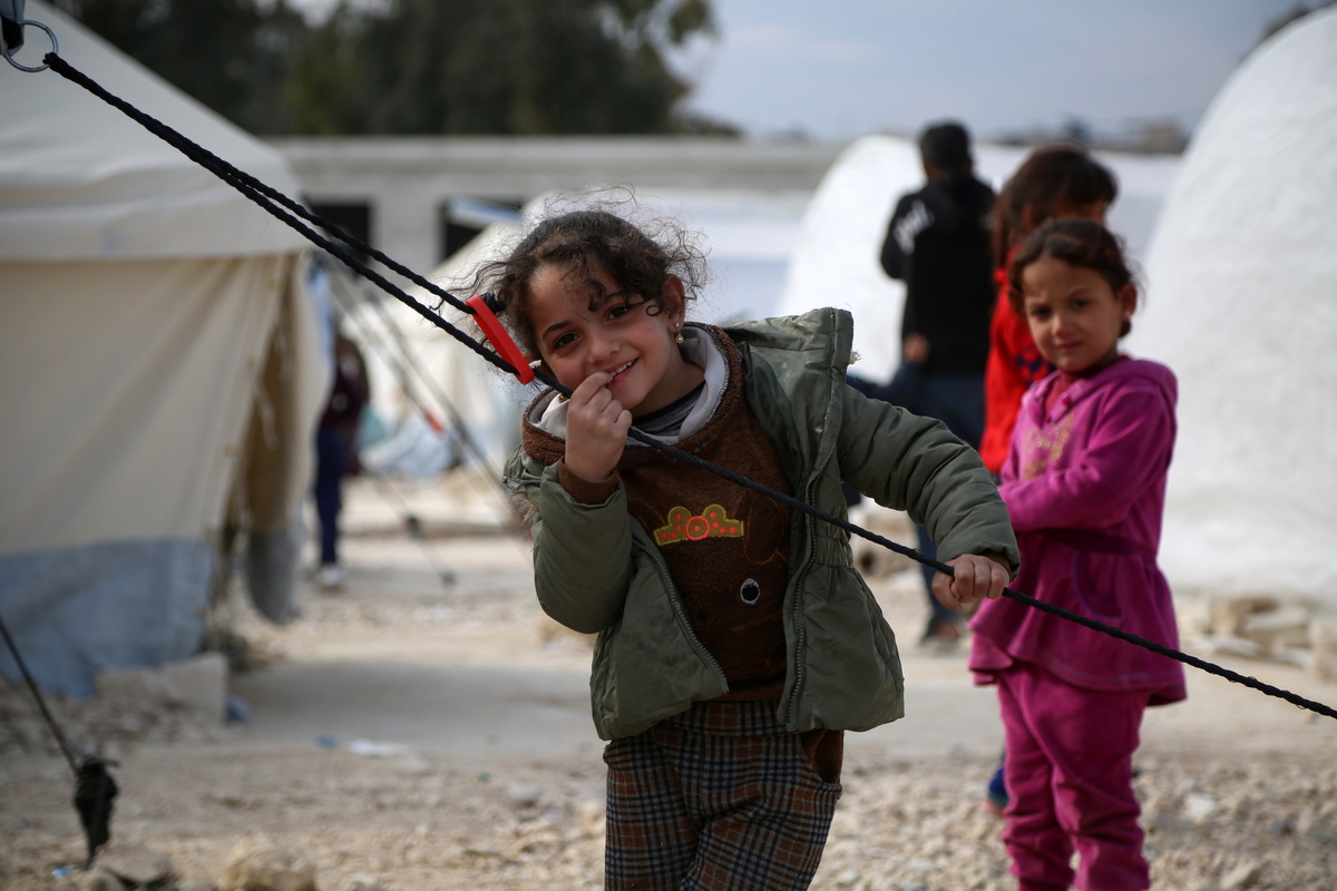 epa11757038 Dipslaced children stand in front of their tent during the visit of a United Nations (UN) delegation at a refugee camp, in the town of Al-Bardaqli, northern Syria, 04 December 2024. Tens of thousands of Syrians have been displaced in recent fighting between rebels and the government in northwest Syria, the UN said on 03 December. Syrian opposition forces, led by the Islamist militant group Hayat Tahrir al-Sham (HTS), launched an offensive on 27 November, taking large parts of Aleppo, Syria's second-largest city, triggering counterattacks by the Syrian regime forces as well as Russian and Syrian airstrikes on opposition-controlled areas. EPA/BILAL AL HAMMOUD