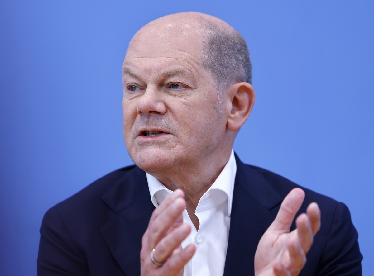 epa10745260 German Chancellor Olaf Scholz talks about domestic and foreign policy issues during the annual summer press conference in Berlin, Germany, 14 July 2023. EPA/HANNIBAL HANSCHKE
