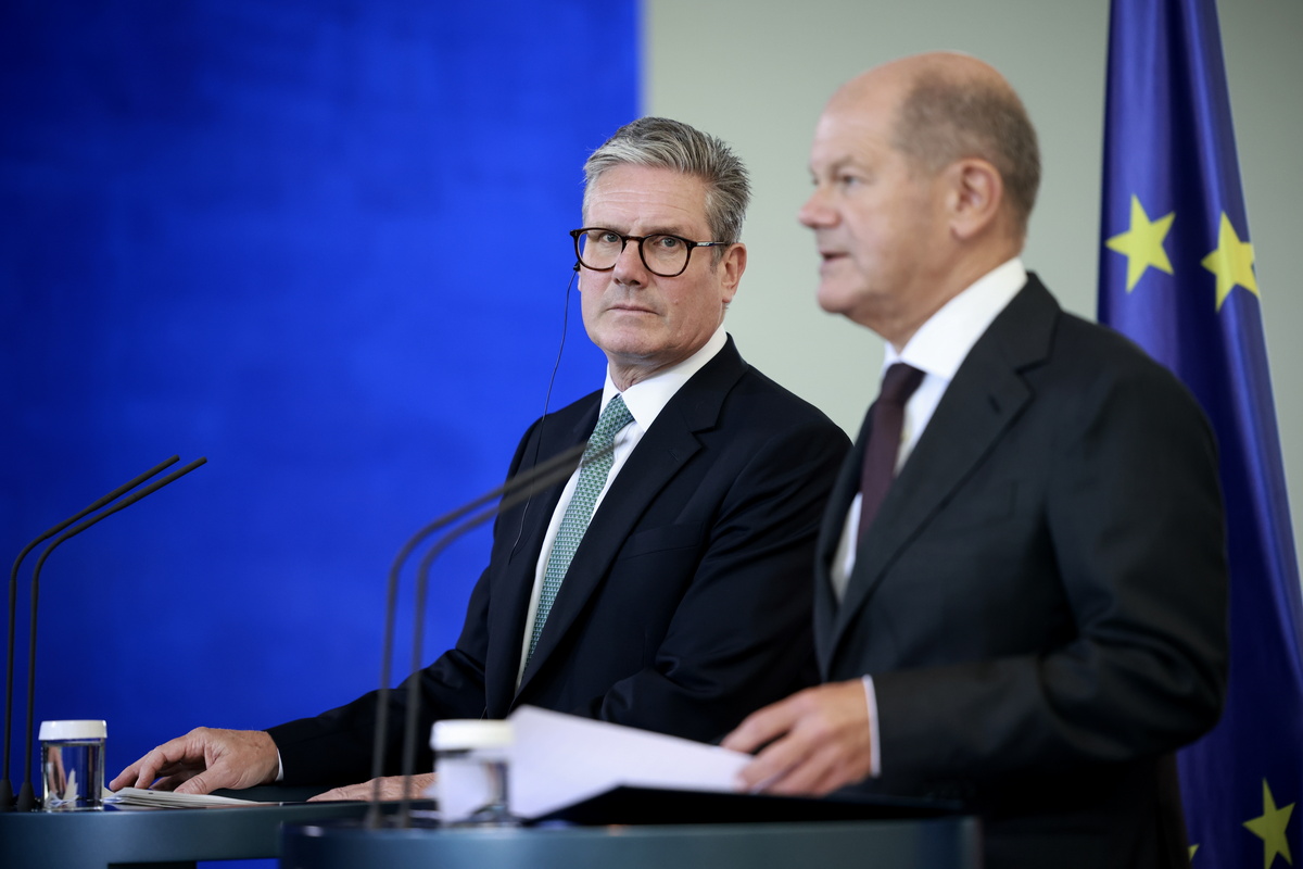 epa11568647 British Prime Minister Keir Starmer (L) looks on next to German Chancellor Olaf Scholz (R) during a joint press conference at the chancellery in Berlin, Germany, 28 August 2024. Keir Starmer is in Berlin to launch negotiations on a new bilateral treaty, aiming to boost business and trade, deepen defense and security cooperation, and increase joint action on illegal migration, according to the Prime Minister's Office 10 Downing Street. EPA/CLEMENS BILAN