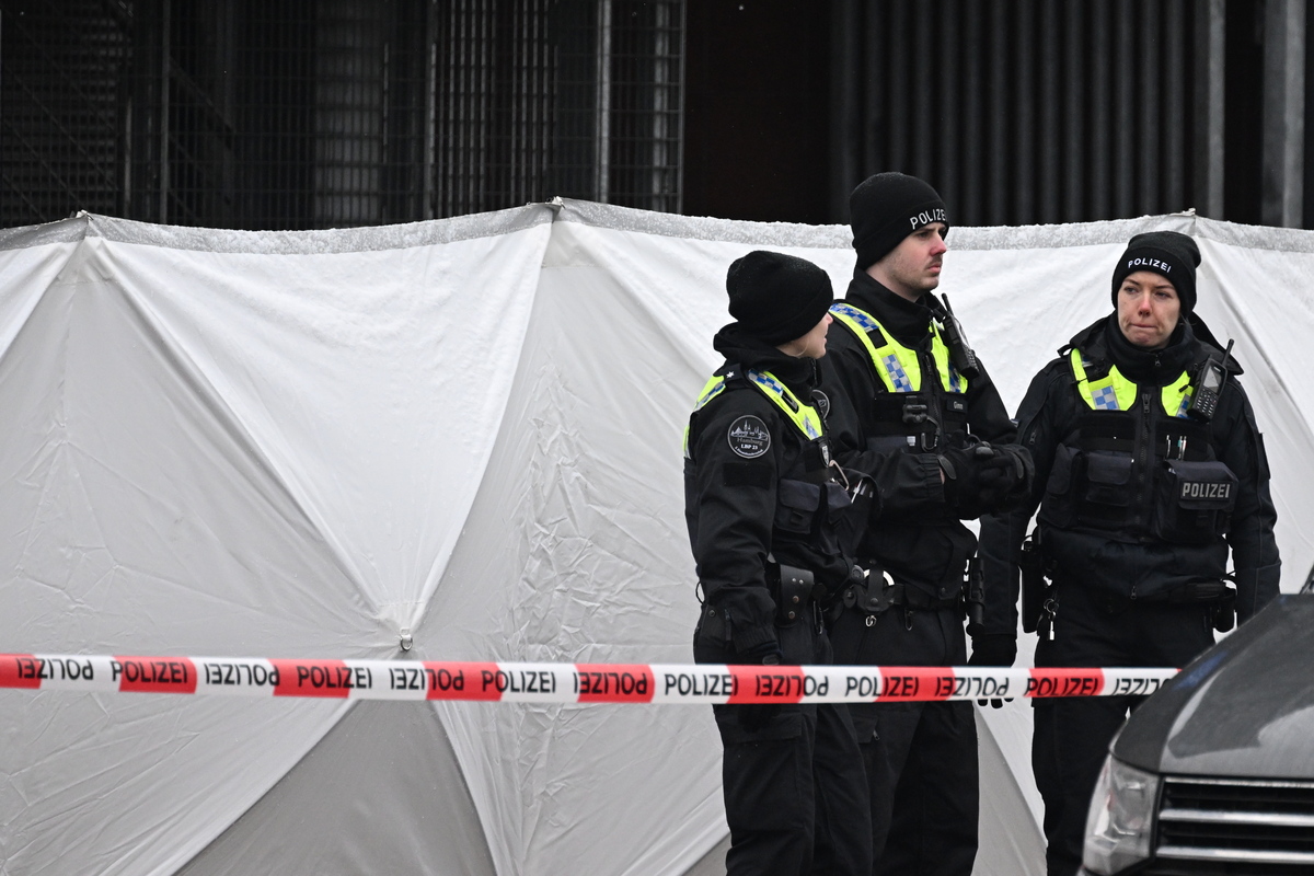 epa10513109 Police officers stand guard at the cordoned-off scene of a shooting in Hamburg, Germany, 10 March 2023. According to police, at least eight people died, including the suspected gunman, and several others were injured in a shooting that occurred at a Jehovah's Witness meeting hall in the evening of 09 March. Investigations into the motive were ongoing. EPA/FILIP SINGER