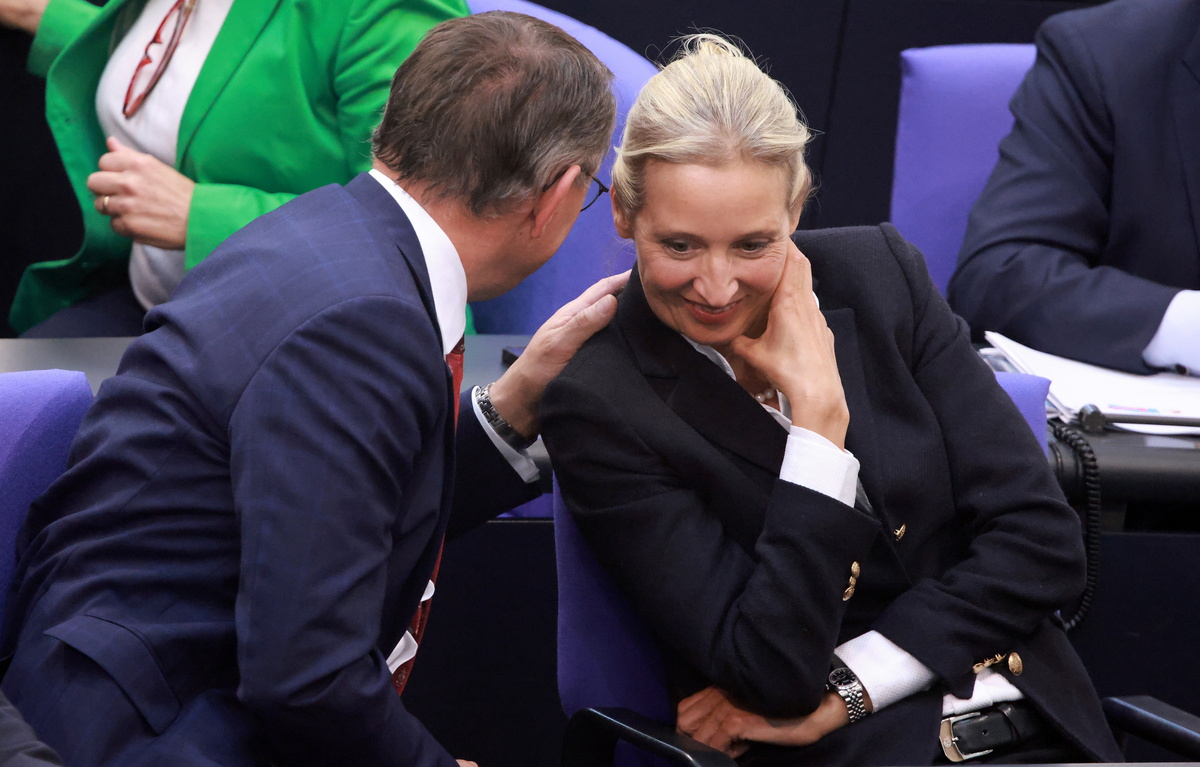 epa12077809 Alternative for Germany (AfD) party and faction co-chairwoman Alice Weidel (R) and co-chairman Tino Chrupalla (L) prior to the second round of voting at the Bundestag in Berlin, Germany, 06 May 2025. The new German government is expected to be formed between the Union parties of Christian Democratic Union (CDU) and Christian Social Union (CSU) and the coalition partner Social Democratic Party (SPD). EPA/CLEMENS BILAN