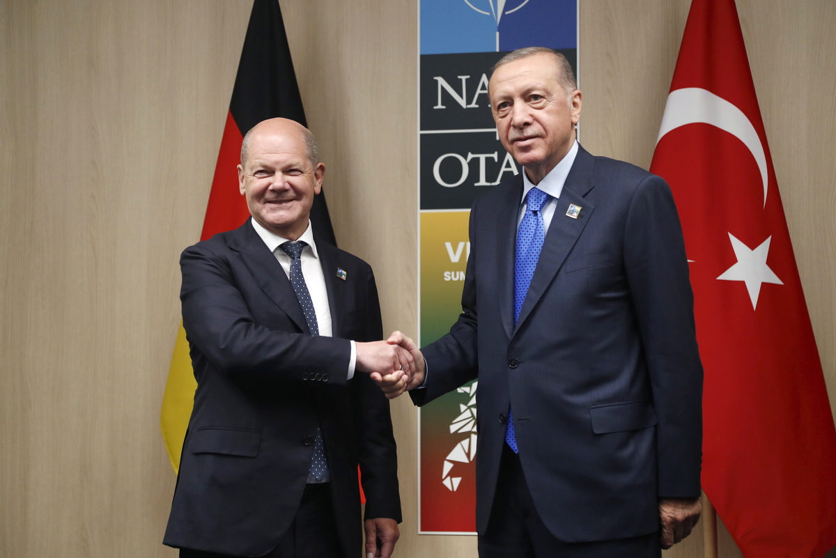 epa10739939 President of Turkey Recep Tayyip Erdogan (R) shakes hands with German Federal Chancellor Olaf Scholz as they attend a bilateral meeting at the NATO summit in Vilnius, Lithuania, 11 July 2023. The NATO Summit takes place in Vilnius on 11 and 12 July 2023 with the alliance's leaders expected to adopt new defence plans. EPA/TOMS KALNINS