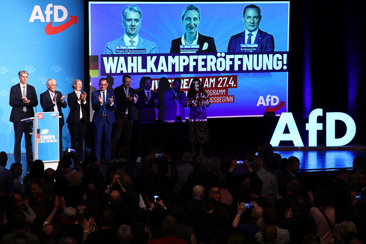 epa11304929 (L-R) Alternative for Germany (AfD) election candidate Dr. Marc Jongen, AfD member of the State Parliament of Baden-Wuerttemberg Emil Saenze, AfD party and faction co-chairwoman Alice Weidel, AfD party and faction co-chairman Tino Chrupalla applaud onstage during the AfD election campaign kick-off for the European elections in Donaueschingen, Germany, 27 April 2024. This year's European Parliament elections are scheduled across EU member states from 06 to 09 June. EPA/ANNA SZILAGYI