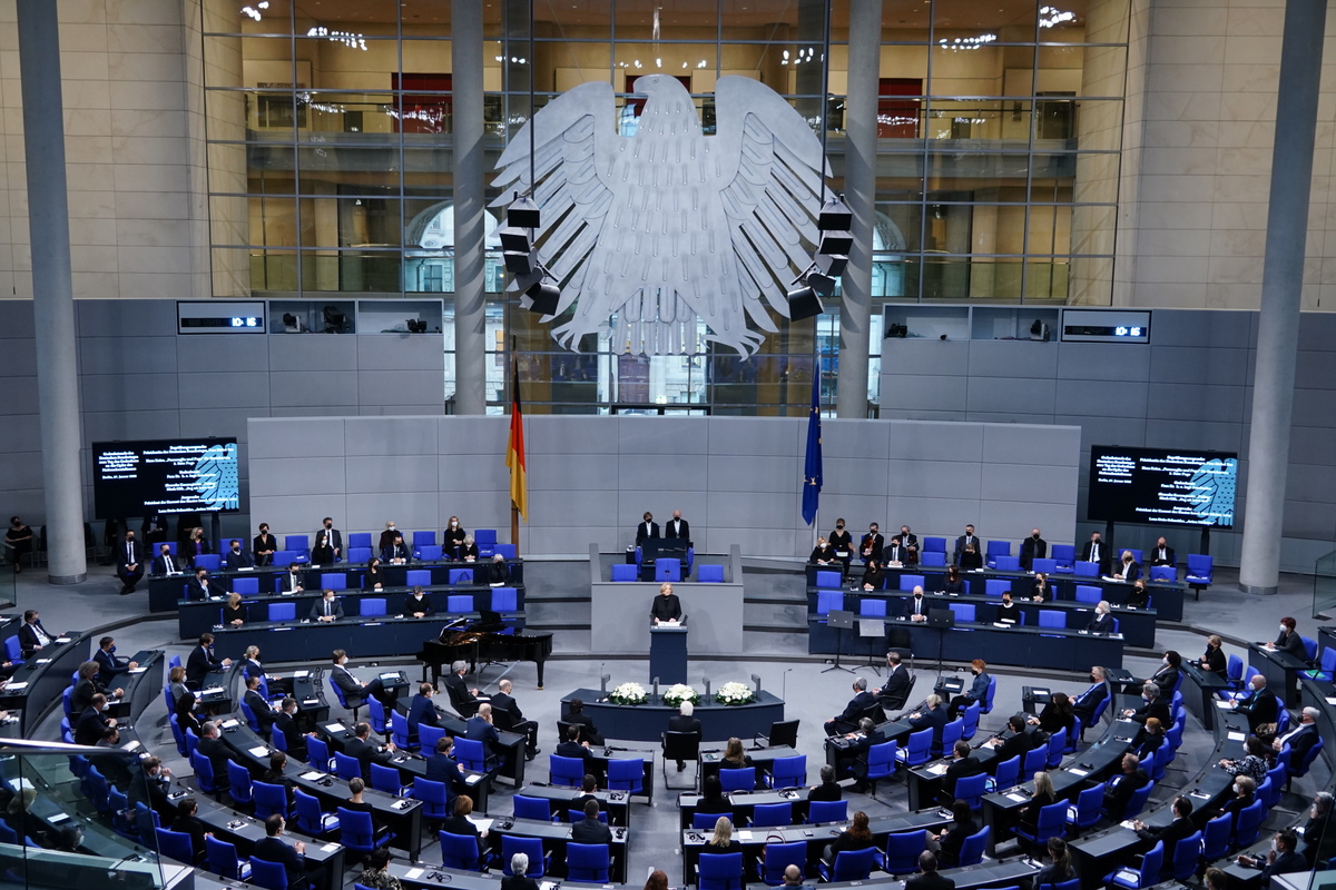 epa09711727 German Bundestag president Baerbel Bas speaks during a Commemoration Ceremony for the victims of the National Socialism in the Reichstag building, the seat of the German federal parliament Bundestag, in Berlin, Germany, 27 January 2022. The International Holocaust Remembrance Day, celebrated on 27 January marks the anniversary of the liberation of the former Auschwitz-Birkenau concentration camp. Approximately more than 17 million victims - Jews, Roma and Sinti, homosexuals, Slavs, handicapped individuals, political prisoners and others - were killed in the Nazi genocide during the period of World War II. EPA/CLEMENS BILAN