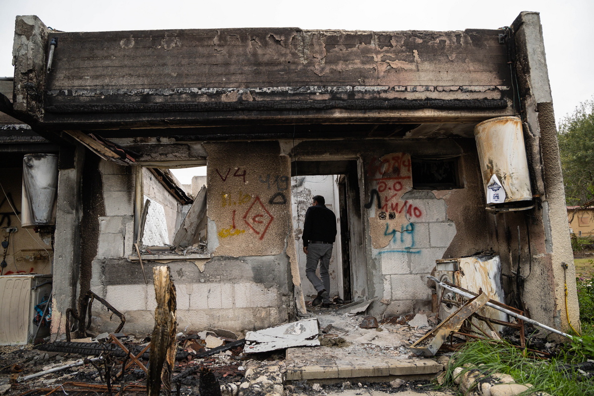 epaselect epa10989458 A man enters a damaged home during a press visit at Kfar Aza Kibbutz, southern Israel, 22 November 2023. The kibbutz, located near the Gaza border, was the scene of an Hamas attack on 07 October which resulted in the deaths of dozens of Israelis. More than 12,700 Palestinians and at least 1,200 Israelis have been killed, according to the Israel Defense Forces (IDF) and the Palestinian health authority, since Hamas militants launched an attack against Israel from the Gaza Strip on 07 October, and the Israeli operations in Gaza and the West Bank which followed it. EPA/CHRISTOPHE PETIT TESSON