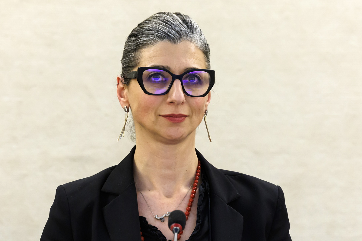 epa11244874 UN Special Rapporteur on the occupied Palestinian territories, Francesca Albanese, listens to delegates' remarks after delivering her report, during the 55th session of the Human Rights Council at the European headquarters of the United Nations in Geneva, Switzerland, 26 March 2024. EPA/SALVATORE DI NOLFI