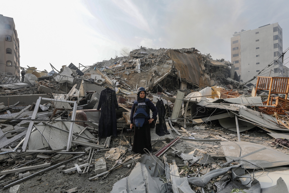 epa10907119 Palestinian press photographer Samar Abu Elouf stands amid the rubble at the site of Al-Watan Tower in Gaza City, 08 October 2023, after it was destroyed in Israeli air strikes. The air strikes, in retaliation for the 07 October Hamas rocket attacks on Israel, caused the 14-storey building to collapse. Israeli air strikes have killed over 300 people in the Gaza Strip, with almost 2,000 wounded, according to Palestinian official sources. EPA/MOHAMMED SABER