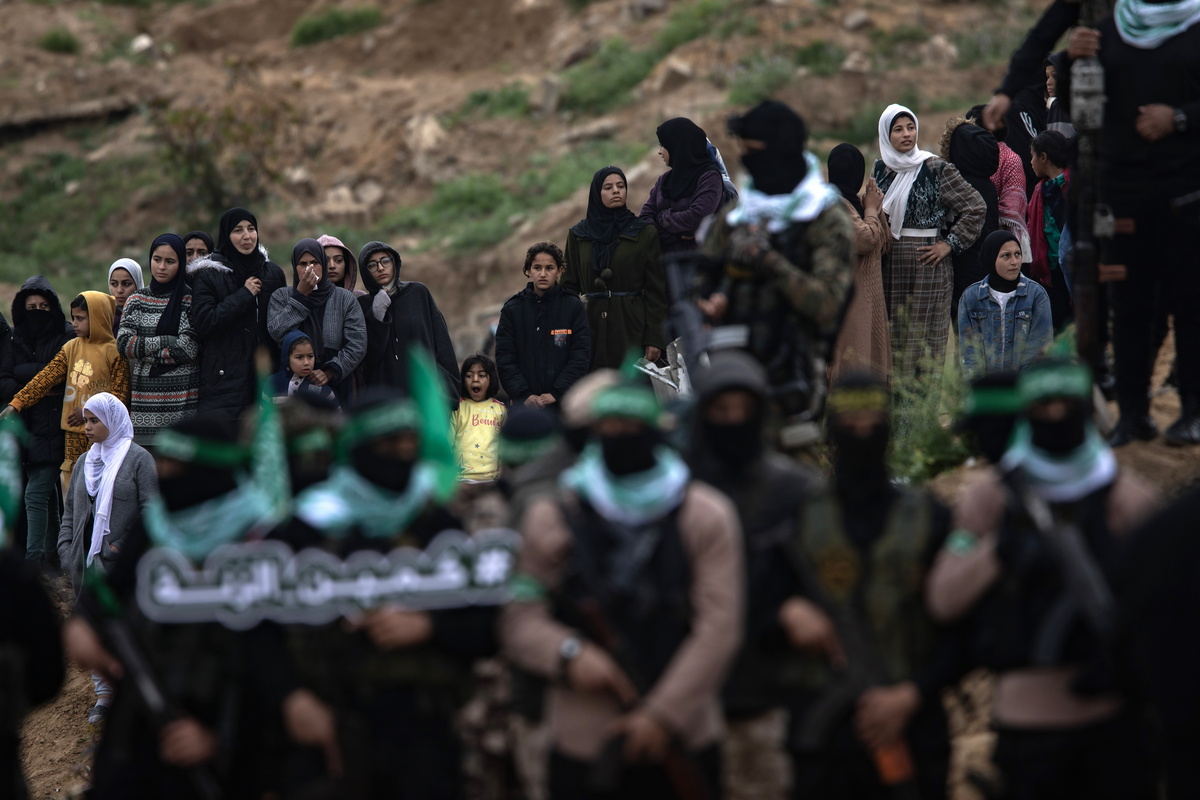 epa11909367 Palestinian civilians stand next to Izz ad-Din al-Qassam fighters following the handover of the bodies of four Israeli hostages to the Red Cross, in Khan Yunis, southern Gaza Strip, Thursday, 20 February, 2025. Hamas was set to hand over the bodies of four Israeli captives, including that of youngest hostage Kfir Bibas, as part of the ongoing Gaza ceasefire deal. Hamas said in November 2023 that the two Bibas boys and their mother had been killed in an Israeli airstrike on Gaza. EPA/HAITHAM IMAD