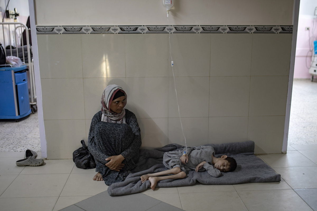epa11467367 Nine-year-old Palestinian child Younis Jumaa, suffering from malnutrition, lies on the floor over a blanket at Nasser Hospital in Khan Yunis, southern Gaza Strip, 08 July 2024. According to the UN, famine is 'imminent' in Gaza as half of its population, 1.1 million people, faces 'catastrophic food insecurity' due to the conflict and restrictions on humanitarian access. Children's acute malnutrition rates have rapidly increased, with one in three children under two years of age suffering from malnutrition. Since 07 October 2023, up to 1.7 million people, or more than 75 percent of the population, have been displaced throughout the Gaza Strip, some more than once, in search of safety, according to the United Nations Relief and Works Agency for Palestine Refugees in the Near East (UNRWA). The World Health Organization (WHO) stated that Palestinians in Gaza constitute around the 80 percent of all people facing famine worldwide. EPA/HAITHAM IMAD