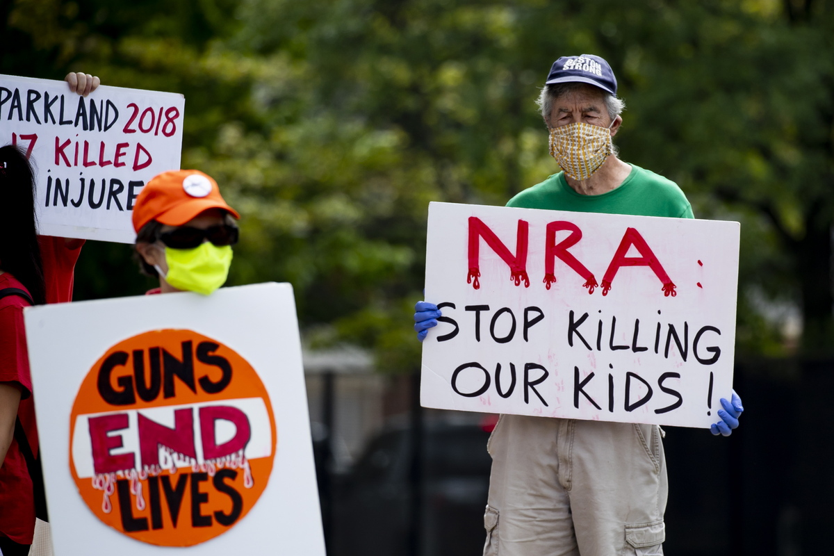 epa08603703 Supporters of gun control reform protest against the National Rifle Association (NRA) at the NRA headquarters in Fairfax, Virginia, USA, 14 August 2020. The NRA faces a lawsuit filed by the New York Attorney General Letitia James that alleges financial crimes and seeks to dismantle the organization. EPA/MICHAEL REYNOLDS