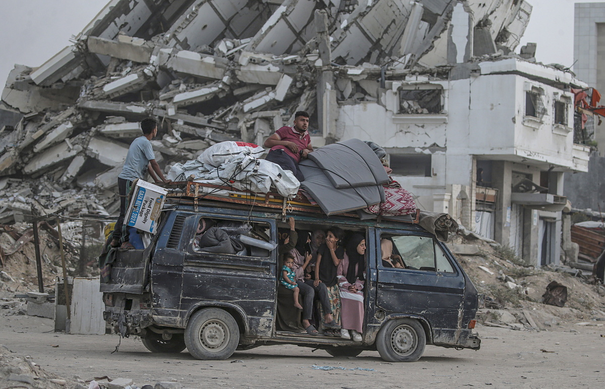 epa12118317 Internally displaced Palestinians leave with their belongings following an evacuation order issued by the Israeli army from the northern Gaza Strip, in Gaza City, 19 May 2025. According to the UN, at least 1.9 million people (or nine in ten people) across the Gaza Strip are internally displaced, including people who have been repeatedly displaced. Since October 2023, only about 11 percent of the Gaza Strip has not been placed under Israeli-issued evacuation orders, the UN aid coordination office OCHA said. EPA/MOHAMMED SABER