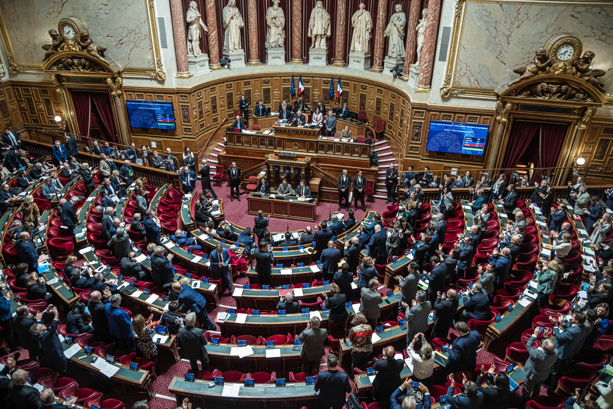 epa11187301 French Senators applaud the results after a vote on constitutional law on abortion during a debate at the French Senate in Paris, France, 28 February 2024. The upper chamber of the French parliament voted on a constitutional bill to enshrine women's right to voluntary termination of pregnancy in the constitution. EPA/CHRISTOPHE PETIT TESSON