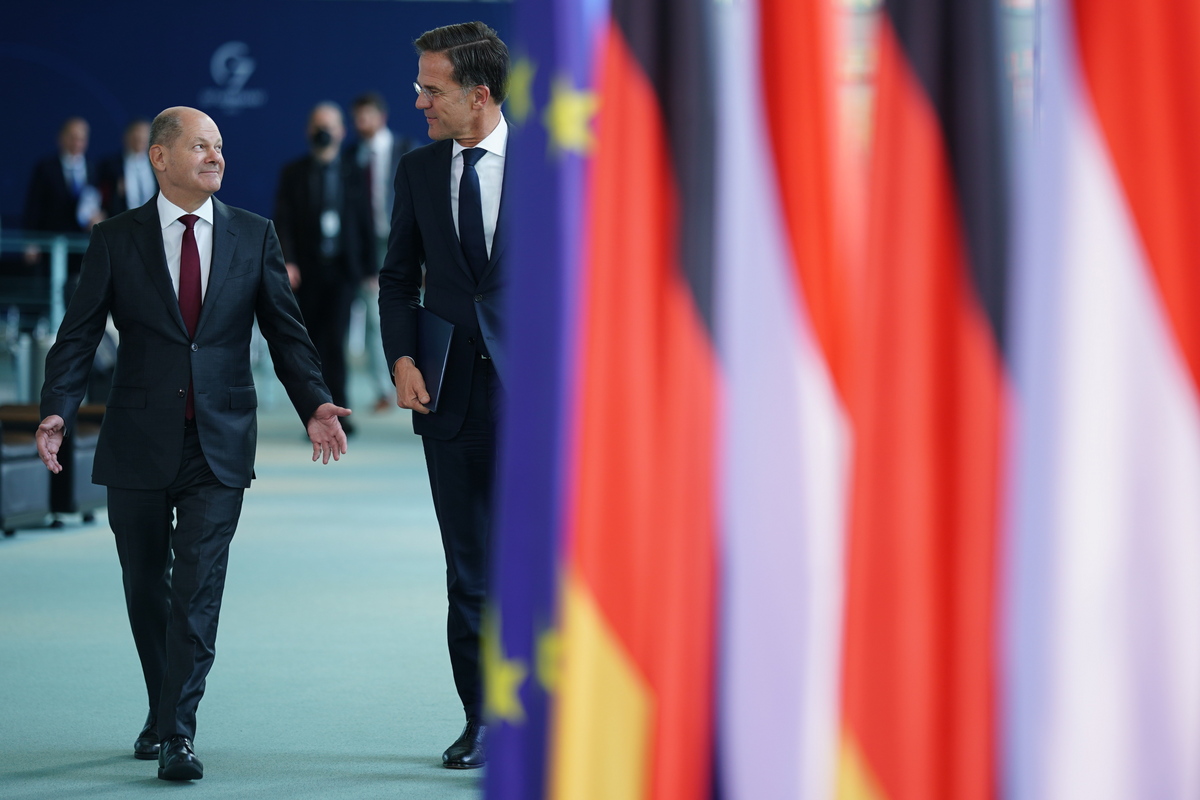 epa10222645 German Chancellor Olaf Scholz (L) and Dutch Prime Minister Mark Rutte arrive for a joint press conference at the Chancellery in Berlin, Germany, 04 October 2022. German Chancellor Olaf Scholz and Dutch Prime Minister Mark Rutte met on the occasion of a German-Dutch climate cabinet session. EPA/CLEMENS BILAN