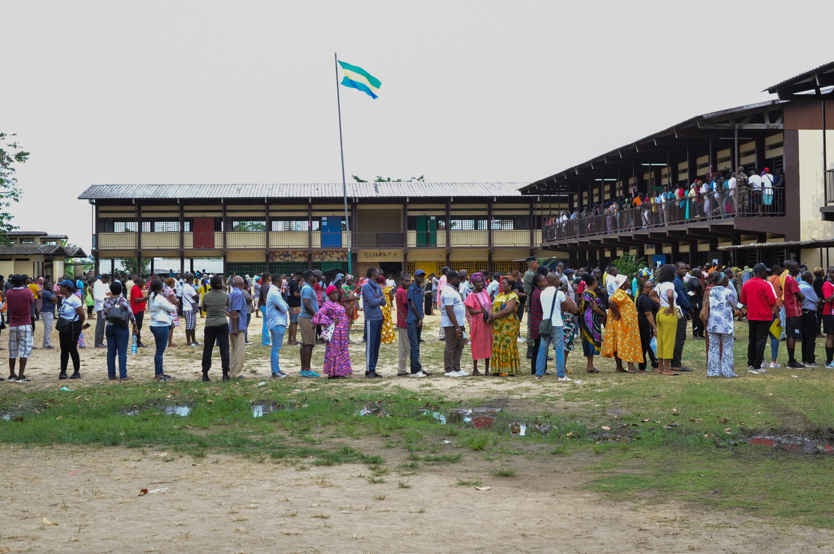 epa10821773 Gabonese citizen line up to cast their votes during the 2023 Gabonese general elections in Libreville, Gabon, 26 August 2023. A little under 850,000 registered voters out of a population of of 2.3 million are to decide whether to give President Ali Bongo Ondimba a third term. EPA/STR