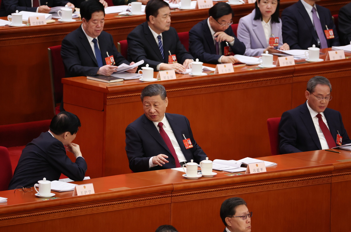 epa11941170 Chinese President Xi Jinping (2nd row C) speaks with Chairman of the Chinese People's Political Consultative Conference Wang Huning (2nd row L) while Chinese Premier Li Qiang (2nd row R) looks on during the opening ceremony of the Third Session of the 14th National People's Congress of China at the Great Hall of the People in Beijing, China, 05 March 2025. China holds two major annual political meetings, the National People's Congress (NPC) and the Chinese People's Political Consultative Conference (CPPCC), which run concurrently and are known as the 'Lianghui' or 'Two Sessions.' EPA/WU HAO