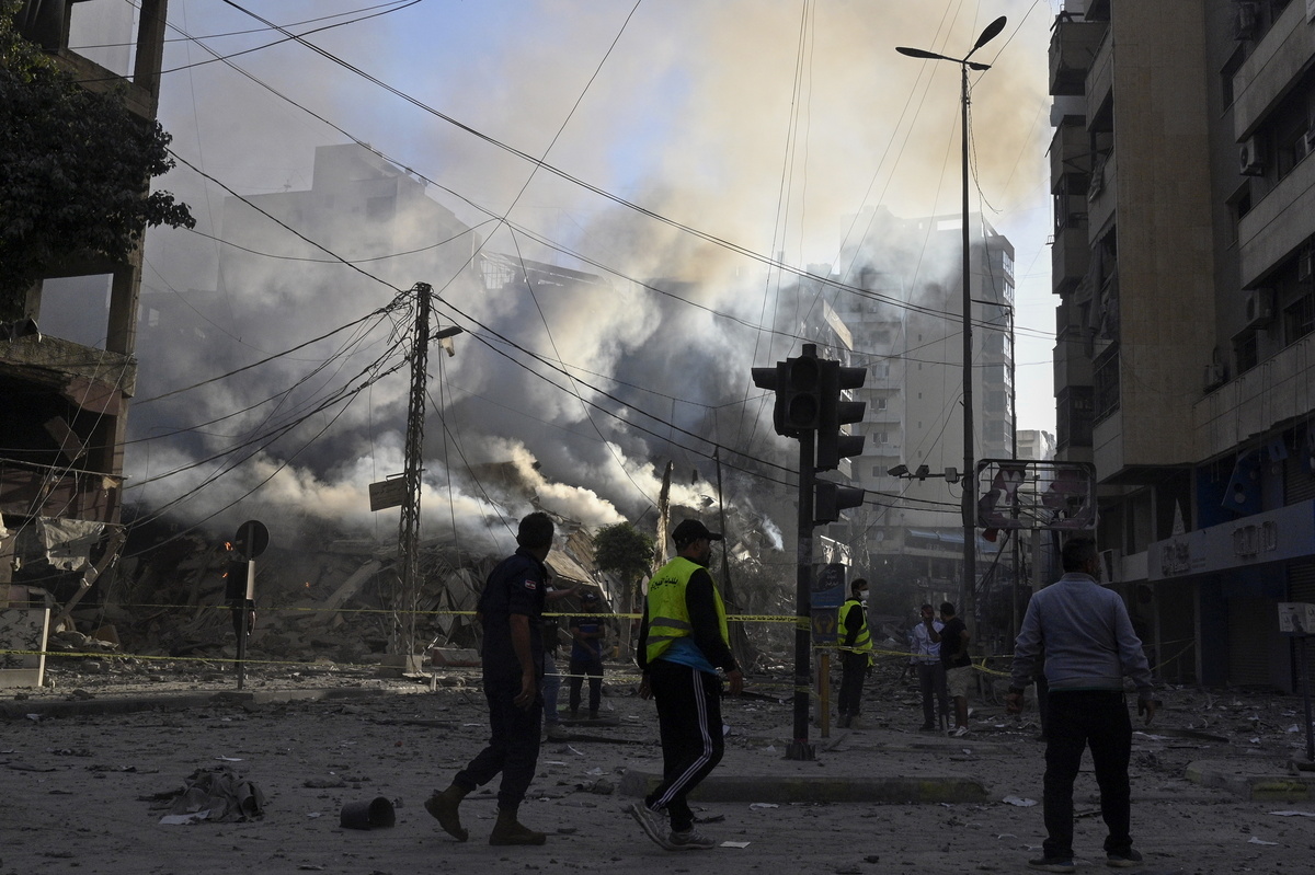 epa11639253 Smoke rises from damaged buildings following Israeli airstrikes in Dahieh, a southern suburb controlled by Hezbollah in Beirut, Lebanon, 03 October 2024. The Lebanese National News Agency (NNA) said that Israeli airstrikes were carried out overnight in the southern suburb, along with shelling from warships at sea. EPA/WAEL HAMZEH