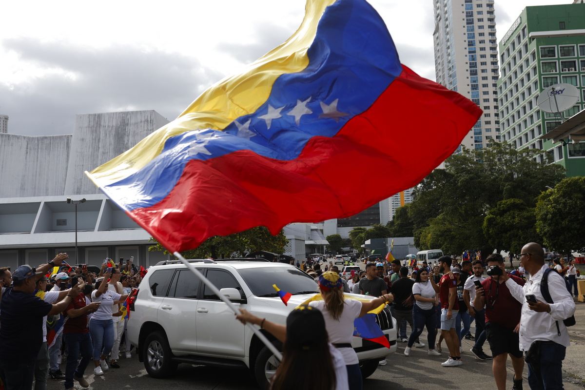epa11813793 A supporter of Venezuelan opposition leader Edmundo Gonzalez Urrutia waves a Venezuelan flag at a rally in support of the president at the Atlantic Pacific Convention Center in Panama City, Panama, 08 January 2025. Gonzalez Urrutia is visiting Panama ahead of Venezuela's presidential inauguration on 10 January 2025, when Nicolas Maduro will assume a new consecutive term amid opposition allegations of fraud in the presidential elections held on 28 July 2024. EPA/BIENVENIDO VELASCO