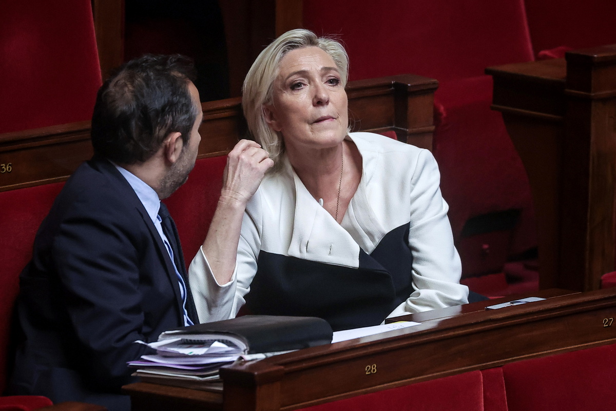 epa11373796 French members of Parliament for far-right party ‘Rassemblement National’ Marine Le Pen (R) and Sebastien Chenu (L) attend the opening session at the French National Assembly to discuss France's end of life bill, in Paris, France 27 May 2024. French parliament members began on 27 May a two-week discussion on France's end of life bill, which opens up the possibility of assisted dying for certain patients, with the final vote on the bill scheduled for 11 June. EPA/CHRISTOPHE PETIT TESSON