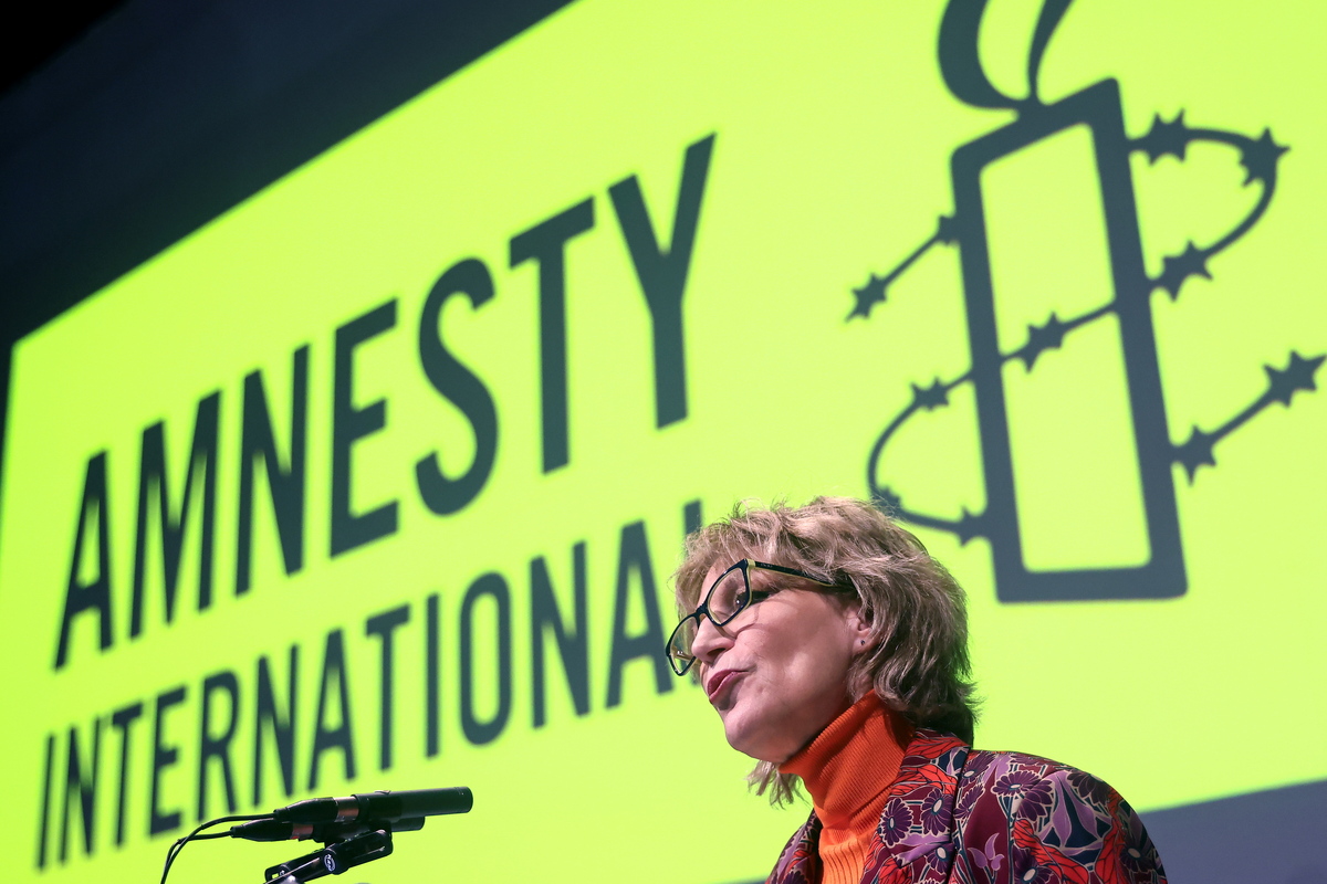epa10546242 Secretary-General of Amnesty International Agnes Callamard delivers a speech during the global press conference as Amnesty International launches its annual report on the global state of human rights, at Palais de Chaillot in Paris, France, 27 March 2023 (issued 28 March 2023). As the Universal Declaration of Human Rights turns 75, Amnesty International held on 27 March 2023 a global press conference in Paris to launch its annual report on the global state of human rights covering 156 countries and providing the most comprehensive overview of human rights in the world today. EPA/MOHAMED BADRA