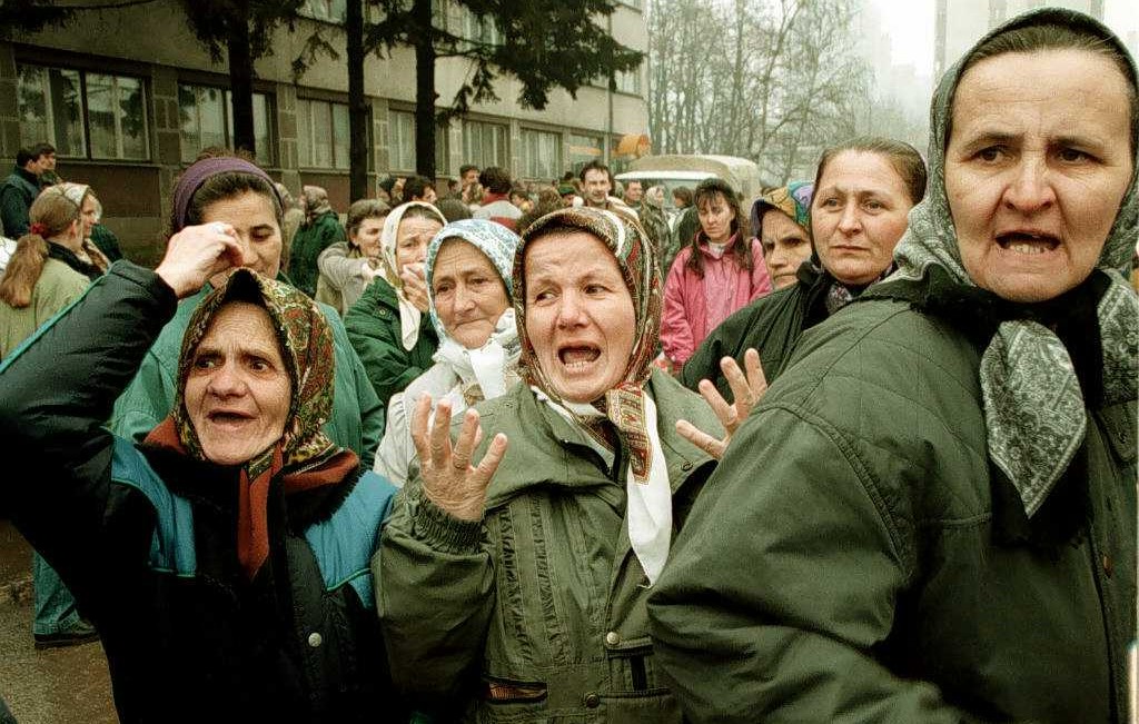 Moslem refugees protesting the failure of the international community to locate thousands of male relatives from the former Srebrenica enclave in eastern Bosnia, here 29 January. Scores of refugees later stormed the International Committee of the Red Cross (ICRC) building in Tuzla, smashing windows and threatening ICRC staff and journalists in their frustration at not knowing what has happened to their kinsmen. Janek SKARZYNSKI