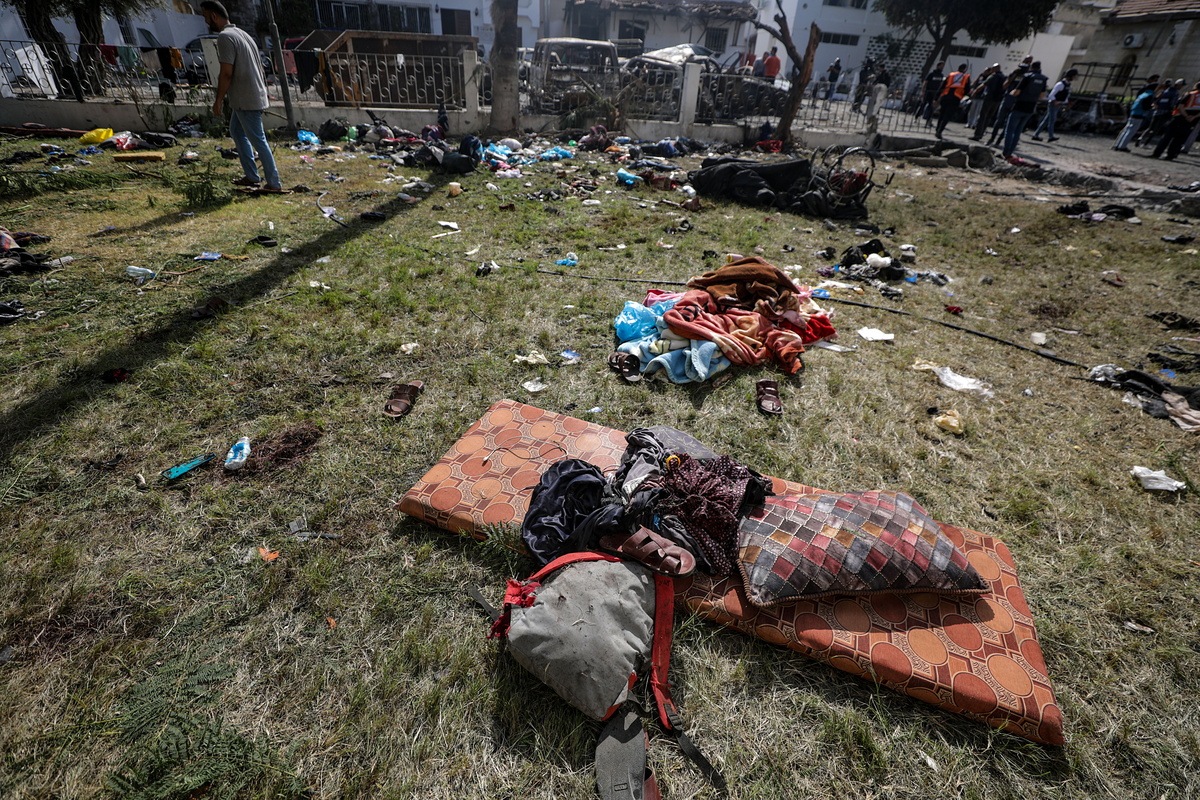 epa10925092 The scene at Al Ahli hospital in Gaza 18 October 2023 following Tuesday's blast after the building was hit by an air strike. According to Palestinian authorities in Gaza hundreds of people have been killed in an airstrike to the hospital in Gaza on 17 October. Israel has denied responsibility and said a Hamas rocket misfire caused the blast. More than 3,000 Palestinians and 1,400 Israelis have been killed according to the Israel Defense Forces (IDF) and the Palestinian Health authority since Hamas militants launched an attack against Israel from the Gaza Strip on 07 October. Israel has warned all citizens of the Gaza Strip to move to the south ahead of an expected invasion. EPA/MOHAMMED SABER