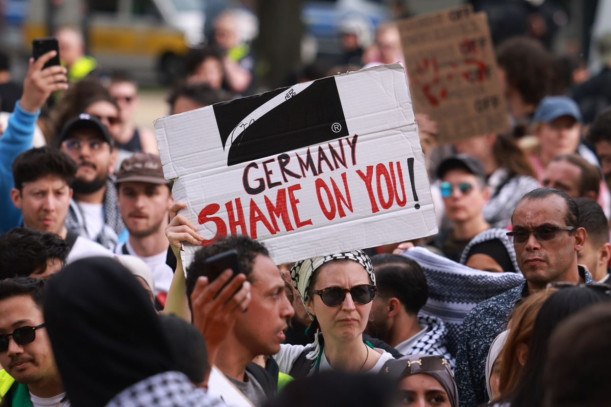 epa11276780 A participant holds a placard reading 'Germany shame on you!' during a rally in reaction to the ban of the 'Palestine Congress' in Berlin, Germany, 13 April 2024. A 'Palestine Congress' was announced to be held from 12 to 14 April 2024 in the German capital of Berlin. According to Berlin police, a conference speaker with a ban on political activity, was broadcasted live during the event. As a reaction, the conference was suspended by Berlin police and eventually completely canceled. EPA/CLEMENS BILAN