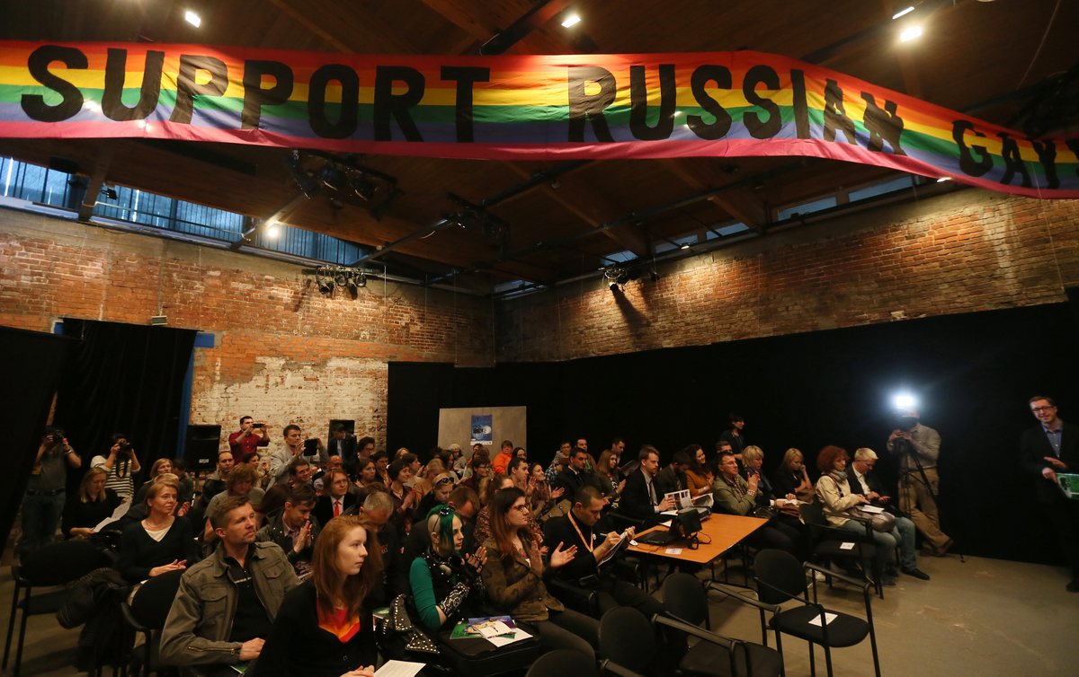 epa04178760 People gather to watch the movie 'Matterhorn' by Dutch director Diederik Ebbinge during the opening of the III LGBT International Film Festival 'Side by Side' in Moscow, Russia, 24 April 2014. The 'Side by Side' Lesbian, Gay, Bisexual and Transgender (LGBT) International Film Festival was founded in Saint Petersburg in 2007. Twenty-four movies are scheduled to be presented at the third edition of the event. EPA/SERGEI ILNITSKY