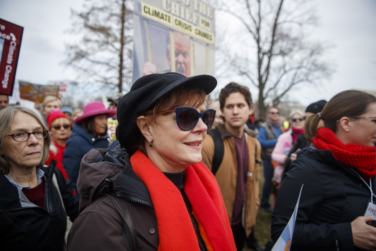 epa08117744 Academy Award winner Susan Sarandon participates in a march during the Fire Drill Friday climate change rally at the US Capitol in Washington, DC, USA, 10 January 2020. Jane Fonda, Golden Globe winner Joaquin Phoenix, Academy Award winner Susan Sarandon and Martin Sheen participated. EPA/SHAWN THEW