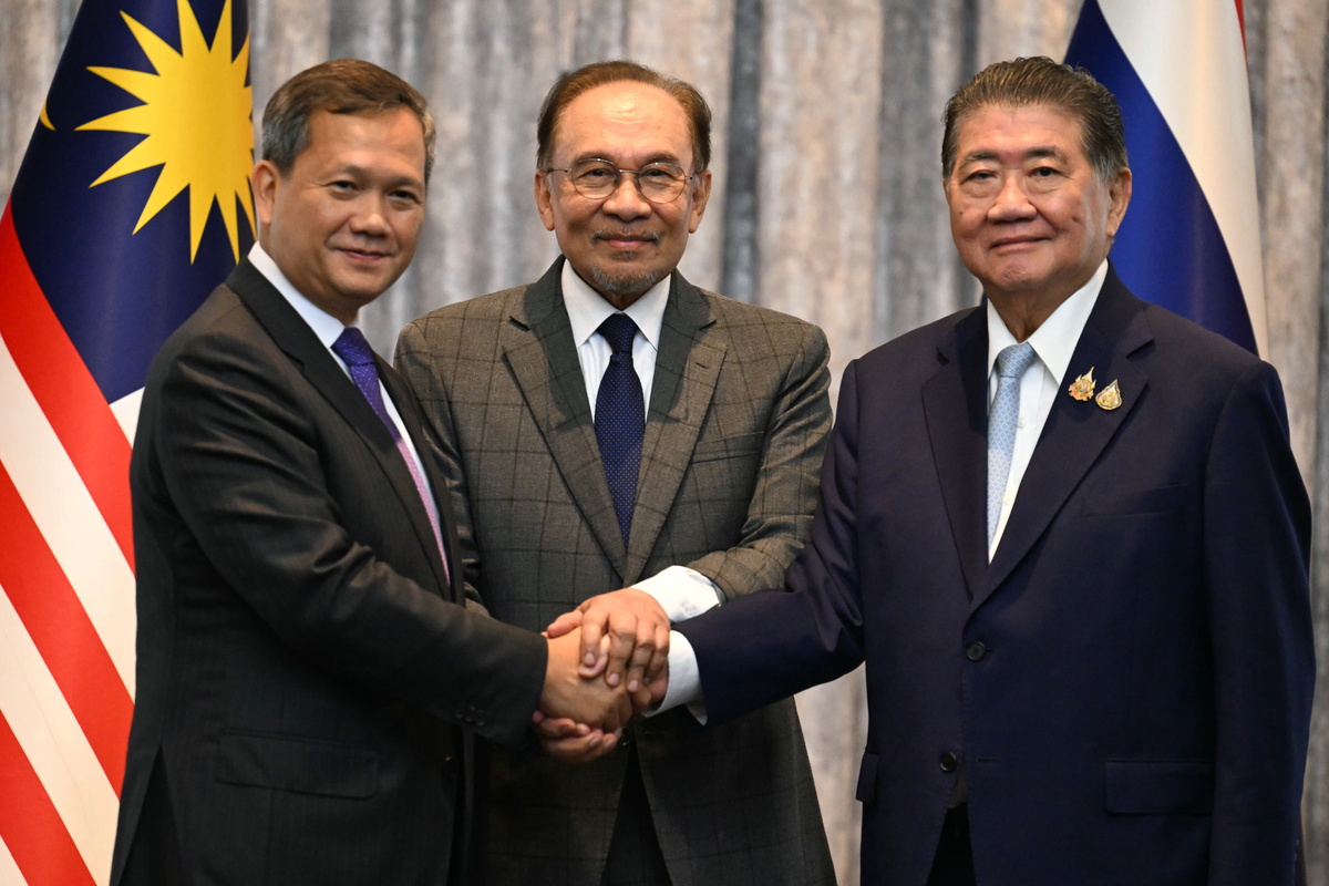 epa12267959 Malaysia's Prime Minister Anwar Ibrahim (C), Cambodia's Prime Minister Hun Manet (L) and Thailand's acting Prime Minister Phumtham Wechayachai (R) pose for photos as they shake hands following a press conference after talks on a possible ceasefire between Thailand and Cambodia in Putrajaya, Malaysia, 28 July 2025. Thailand and Cambodia's leaders are due to meet for peace talks on 28 July, as a festering territorial dispute along their shared frontier dragged into a fifth day of open combat. EPA/MOHD RASFAN / POOL