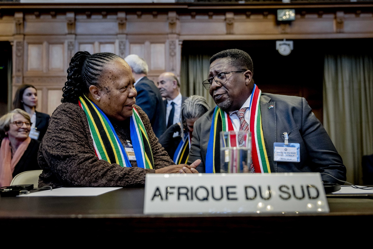 epa11105745 South African Foreign Minister Naledi Pandor and Vusimuzi Madonsela, the South African Ambassador to the Netherlands, during a ruling by the International Court of Justice (ICJ) in The Hague, The Netherlands, on a request by South Africa for emergency measures for Gaza, 26 January 2024. The UN court is to deliver an interim ruling in South Africa's genocide case against Israel and decide whether to issue emergency measures ordering Israel to halt its operations in Gaza. EPA/Remko de Waal