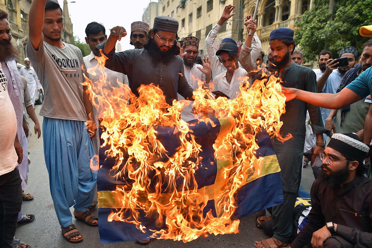 epaselect epa10732666 Demonstrators burn a Swedish flag during a protest against the burning in Sweden of a copy of the Koran, the Muslims' holy book, in Karachi, Pakistan, 07 July 2023. Pakistan's prime minister called for nationwide protests on 07 July against a recent desecration of the Koran, the holy book of Islam, in Sweden. An Iraqi refugee living in Sweden set fire to a copy of the Koran during a protest in front of a mosque in Stockholm on 28 June 2023. The act drew widespread outrage and condemnation from several countries, including Pakistan, Turkey, Saudi Arabia, Jordan, Palestine, Morocco, Iran, Iraq, and the European Union. EPA/SHAHZAIB AKBER