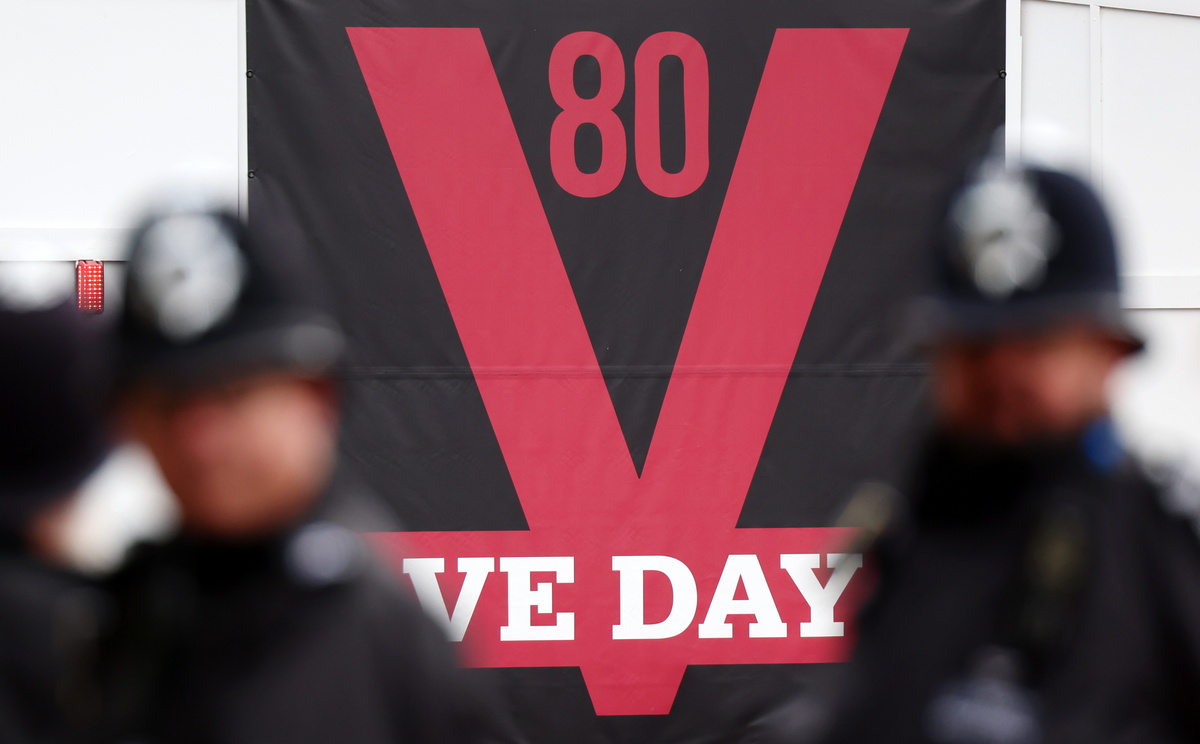 epaselect epa12074517 Police stand in front of a VE Day 80 sign ahead of a military procession to commemorate the 80th anniversary of Victory in Europe (VE Day) in London, Britain, 05 May 2025. Around 1,000 UK service personnel from the Royal Navy, the Royal Marines, the British Army and the Royal Air Force will join the procession, including personnel from the Ukrainian armed forces who have been deployed to the UK on Operation Interflex. EPA/ANDY RAIN