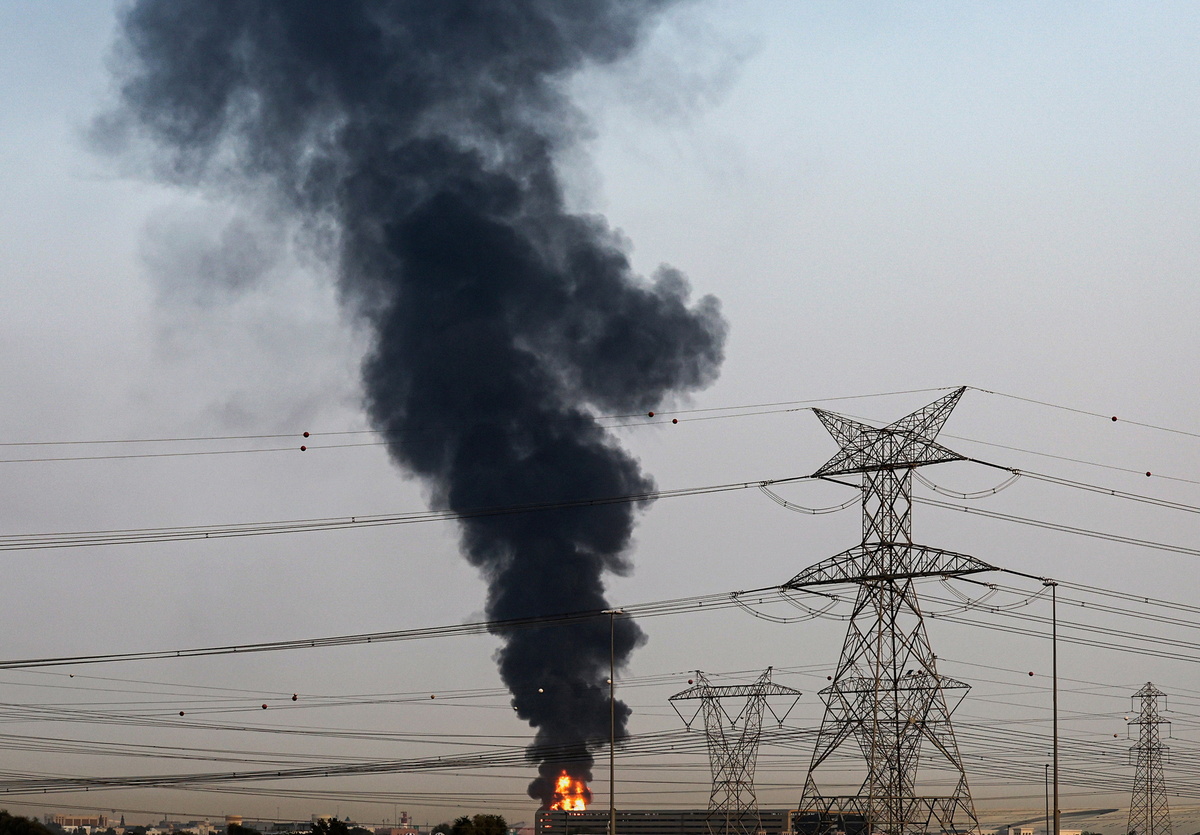 epa12824763 Smoke rises from an area near Dubai International Airport (DXB) in Dubai, United Arab Emirates, 16 March 2026, amid the US-Israel conflict with Iran. The Dubai Media Office reported a 'drone incident' in the vicinity of the airport that affected a fuel tank, igniting a large fire. Authorities temporarily suspended all flights at the airport as a precautionary measure; no injuries have been reported. Civil defense teams successfully contained the fire by morning. EPA/STRINGER