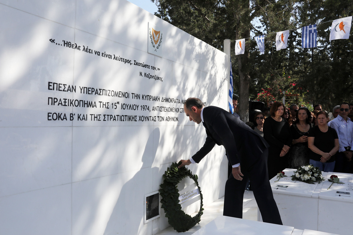 Ìå äéÜöïñåò åêäçëþóåéò ìíÞìçò êáé ôéìÞò ï êõðñéáêüò ëáüò ôéìÜ óÞìåñá áõôïýò ðïõ Ýðåóáí êáôÜ ôï ðñáîéêüðçìá ôçò 15çò Éïõëßïõ 1974 ãéá ôçí õðåñÜóðéóç ôçò äçìïêñáôßáò êáé ôçò íïìéìüôçôáò, Ëåõêùóßá, Êýðñïò, ÄåõôÝñá 15 Éïõëßïõ 2019. Óõìðëçñþíïíôáé öÝôïò 45 ÷ñüíéá áðü ôï ðñáîéêüðçìá êáôÜ ôïõ Áñ÷éåðéóêüðïõ Ìáêáñßïõ óôéò 15 Éïõëßïõ 1974, ìå åíôïëÞ ôçò ÷ïýíôáò ôïõ Éùáííßäç. ÁÐÅ-ÌÐÅ/ÊÕÐÅ/ÊÁÔÉÁ ×ÑÉÓÔÏÄÏÕËÏÕ