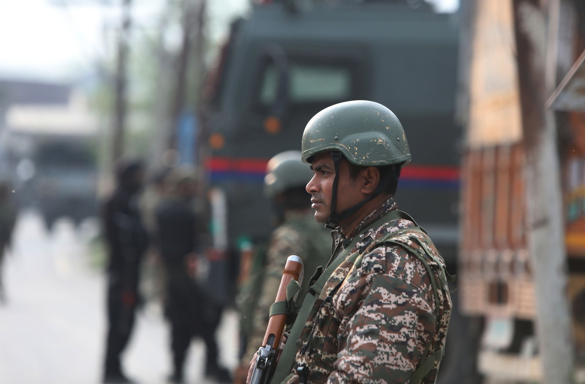 epa12079149 Indian security forces patrol a road in Pampore, in the outskirts of Srinagar, India, 07 May 2025. On 07 May, the Indian Armed Forces launched 'Operation Sindoor', hitting alleged terrorist infrastructure in Pakistan and Pakistan-occupied Jammu and Kashmir. EPA/FAROOQ KHAN