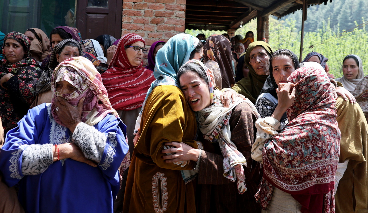 epaselect epa12048500 Family members grieve during the funeral of Adil Hussain Shah in Hapatnur, Anantnag district, India, 23 April 2025. According to officials, terrorists attacked the popular tourist destination of Pahalgam in south Kashmir, resulting in at least 26 deaths and several injuries, with Shah being one of the victims. EPA/FAROOQ KHAN