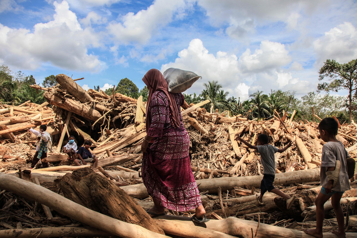epa12578271 People walk among logs swept away by a flash flood at a flood affected area in Aceh Tamiang, Aceh province, Indonesia, 08 December 2025. According to the National Disaster Management Agency, floods and landslides triggered by Tropical Cyclone Senyar have killed 961 people across the provinces of Aceh, North Sumatra, and West Sumatra, while 293 are reported missing. EPA/ALBERT IVAN DAMANIK