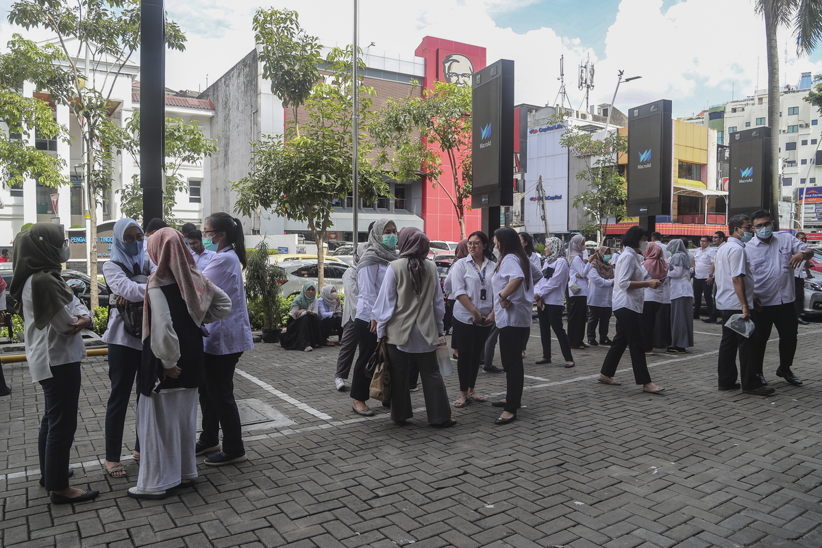epa10317215 People stay outside amid fears of aftershocks following an earthquake at a business area in Jakarta, Indonesia, 21 November 2022. According to Indonesia's meteorology agency (BMGK) a 5.6 magnitude quake hit southwest of Cianjur, West Java. EPA/BAGUS INDAHONO