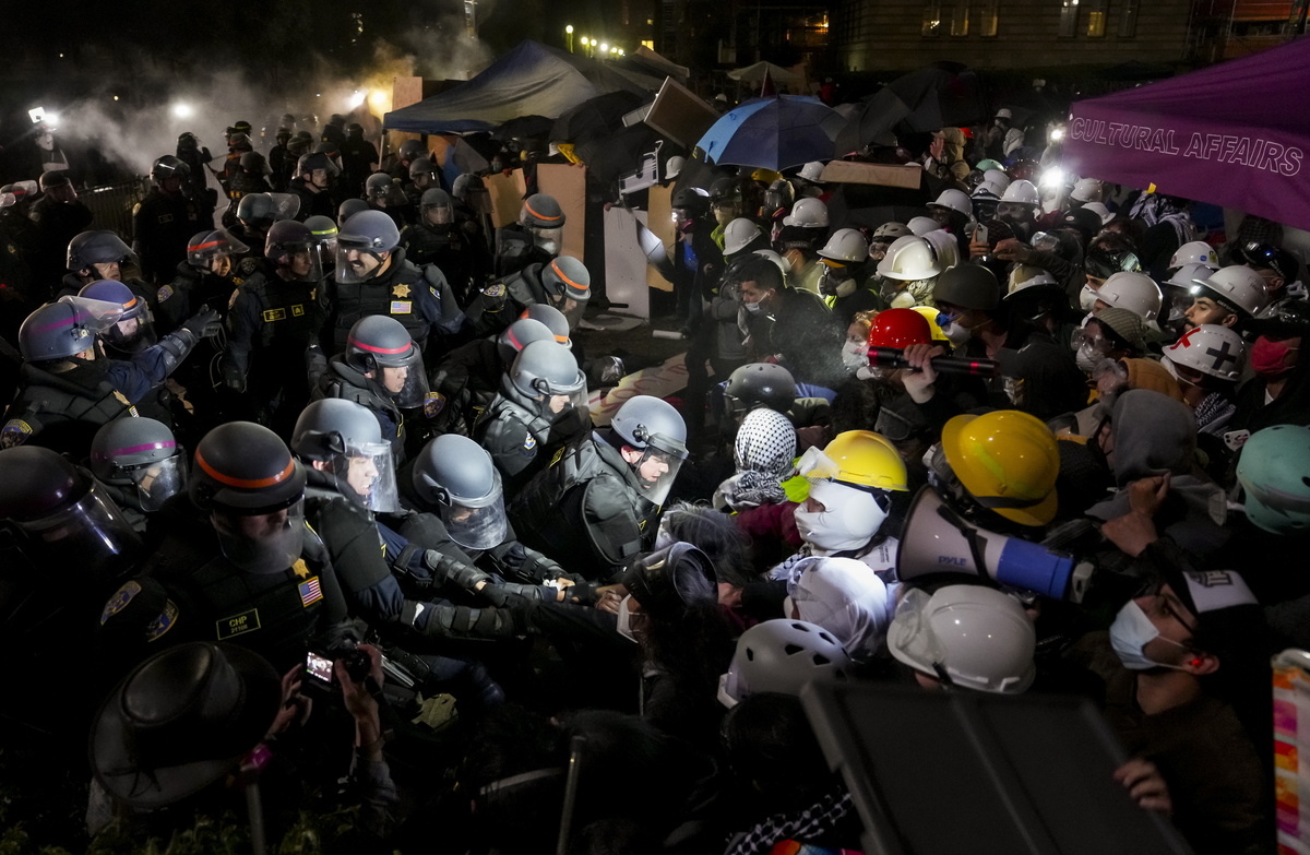 epa11314303 Police officers confront demonstrators gathered at the ongoing encampment of pro-Palestinian protesters on the campus of University of California Los Angeles (UCLA) in Los Angeles, California, USA, 02 May 2024. Nationwide protests have sprung up across the country on school campuses, many calling for institutions to divest investments in Israel and in support of a ceasefire in the Gaza conflict. EPA/ALLISON DINNER