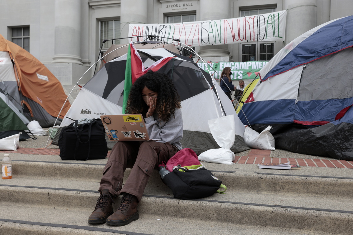 Φοιτητές στο πανεπιστήμιο Μπέρκλεϊ της Καλιφόρνιας – γνωστό για τον ακτιβισμό των φοιτητών του τη δεκαετία του 1960—έστησαν σκηνές σε αλληλεγγύη με τους διαδηλωτές σε άλλα πανεπιστήμια.