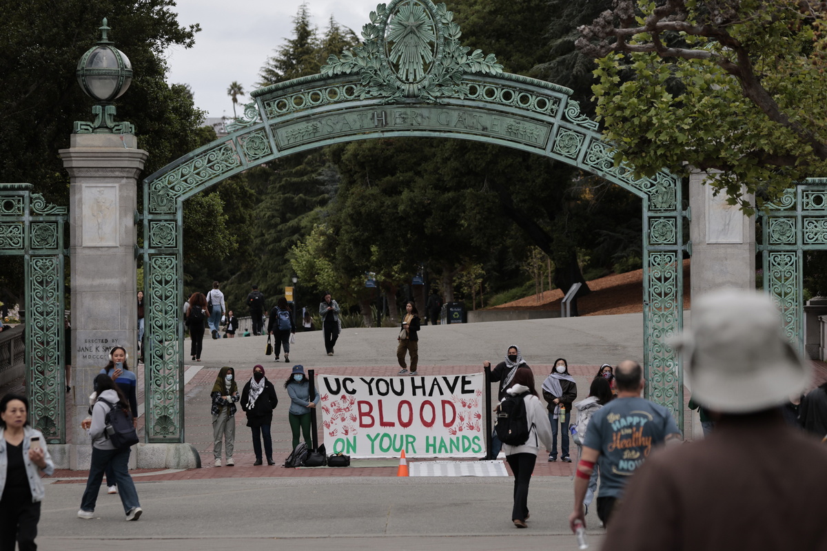 epa11296678 Students stand under Sather Gate at the University of California Berkeley (UC Berkeley) campus to protest UC Berkeley’s investment ties to Israel in Berkeley, California, USA, 23 April 2024. More than 34,000 Palestinians and over 1,450 Israelis have been killed, according to the Palestinian Health Ministry and the Israel Defense Forces (IDF), since Hamas militants launched an attack against Israel from the Gaza Strip on 07 October 2023, and the Israeli operations in Gaza and the West Bank which followed it. EPA/JOHN G. MABANGLO